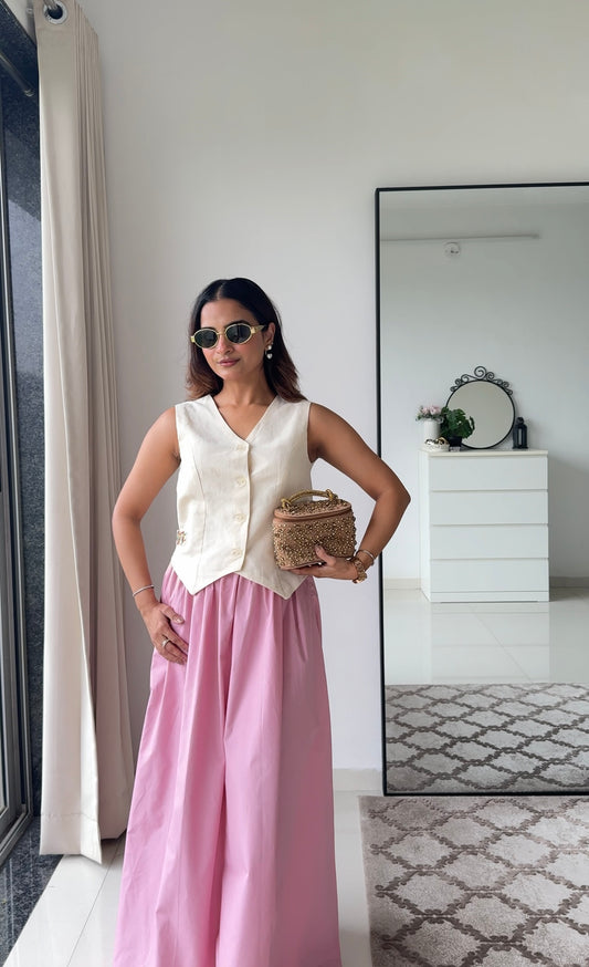 Laya Pink Co-ord Set | Linen Waistcoat & Pink Cotton Poplin Maxi Skirt | Women’s Fusion Wear