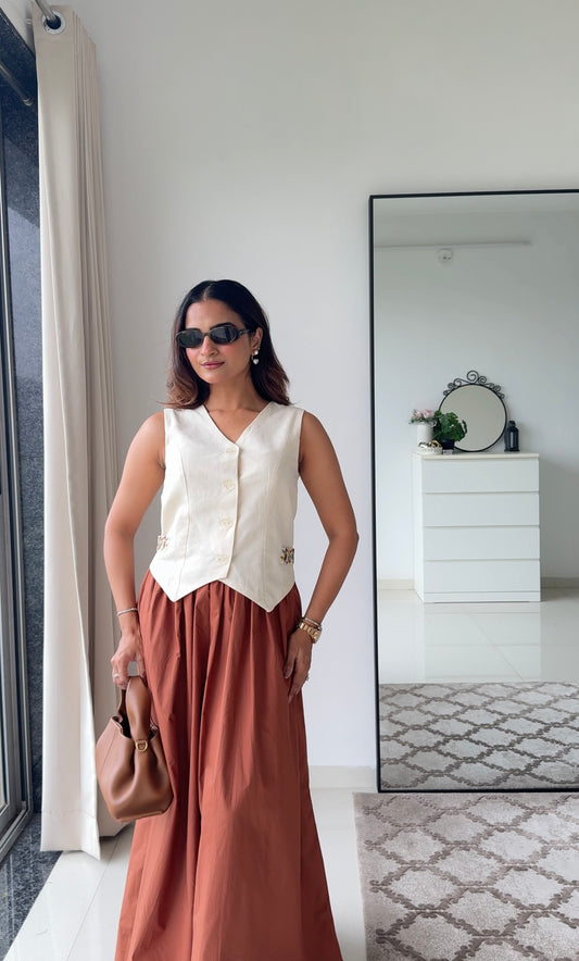 Laya Co-ord Set | Cotton Linen Waistcoat & Brown Cotton Poplin Maxi Skirt | Women’s Fusion Wear