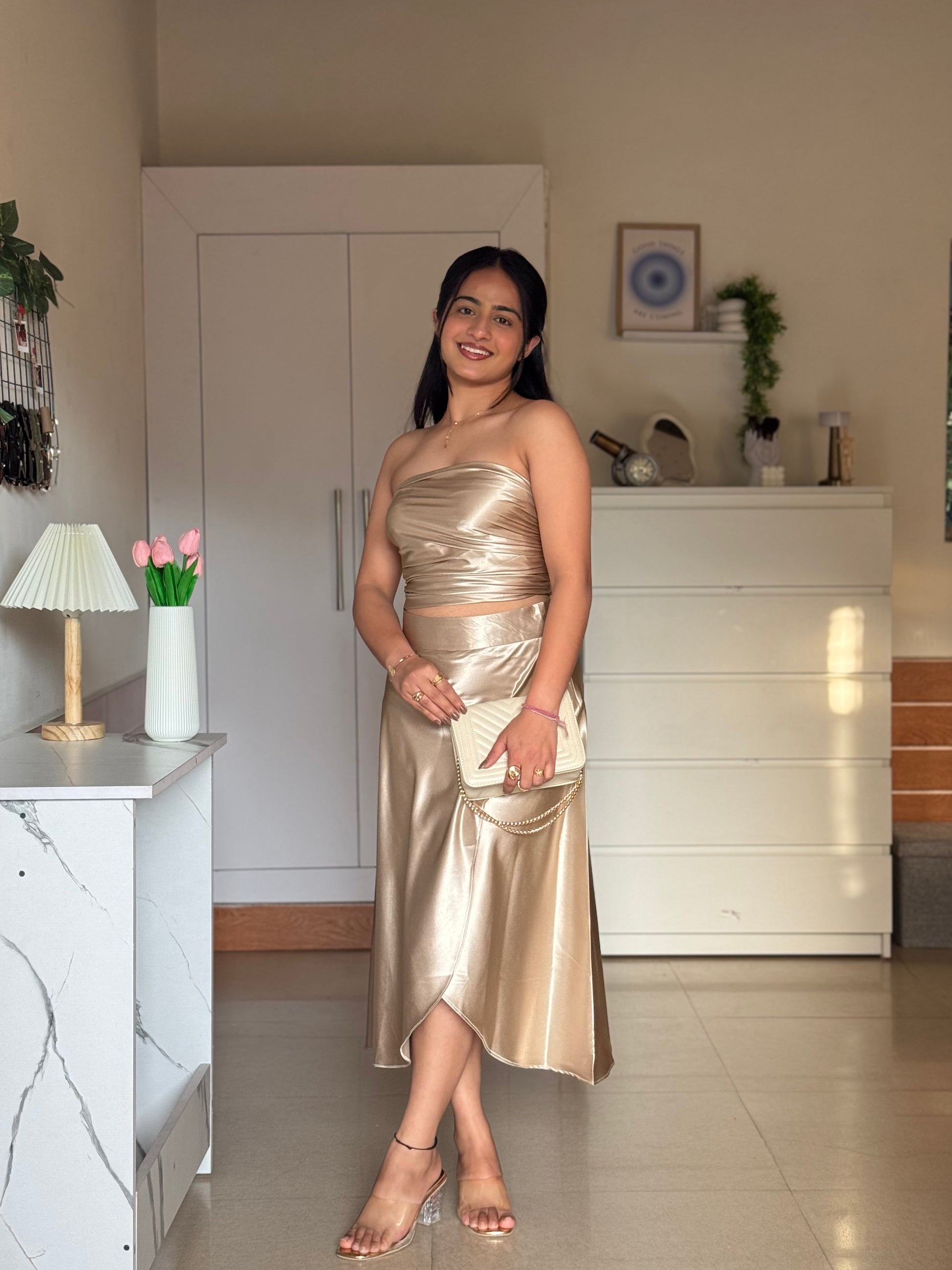 A luminous two-piece satin set crafted for effortless elegance. Featuring a sculpted satin tube top paired with a fluid midi skirt, this golden co-ord is designed to move with grace and glow with confidence.