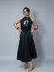 Crafted in a fluid black silhouette, Luna features a refined halter neckline and subtle abstract detailing that adds character without overpowering the look. The structured piping enhances the waist, while the flared midi hem creates graceful movement and a flattering shape.