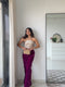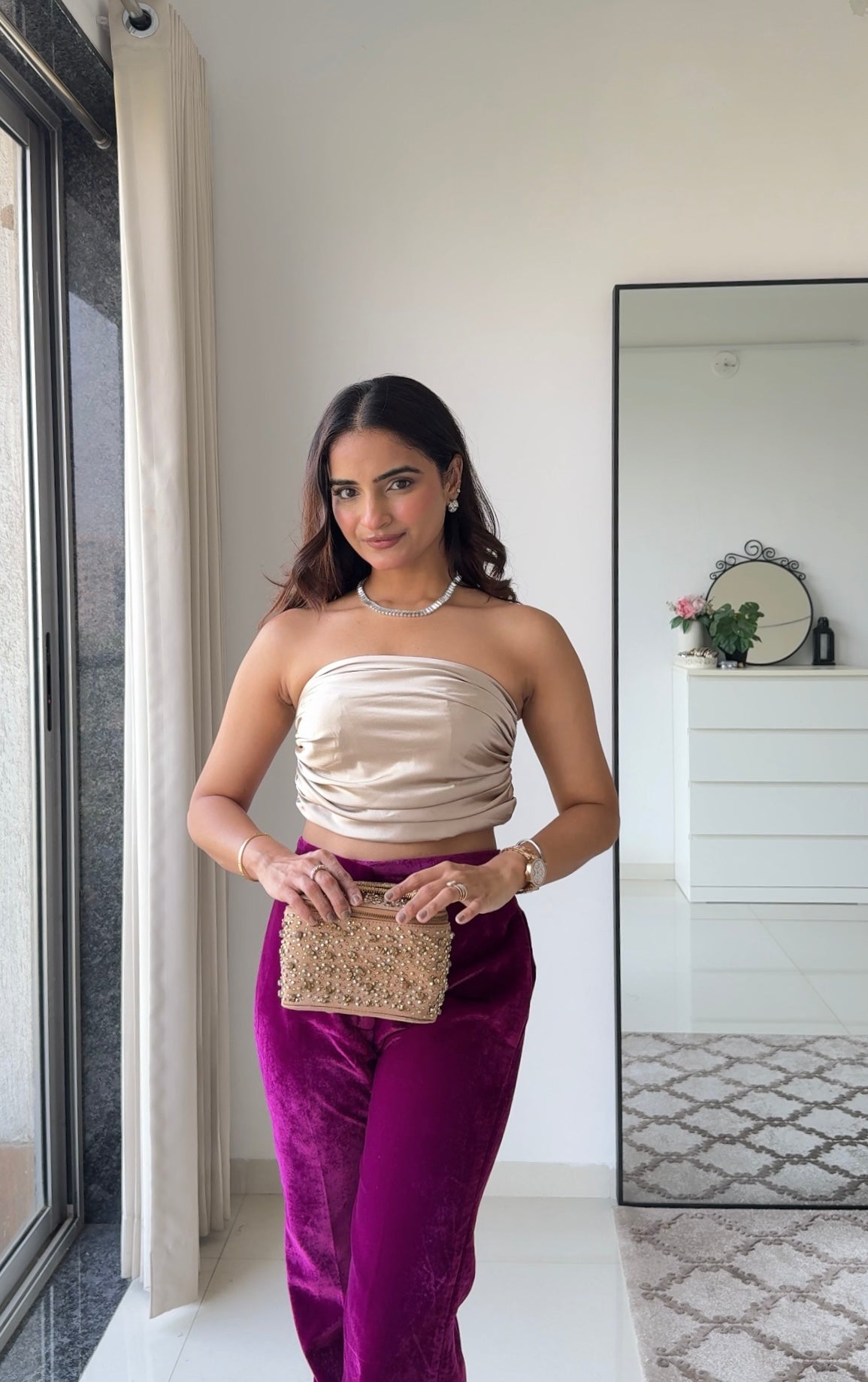This co-ord features high-waist wine velvet pants that elongate your silhouette and offer a sleek, flattering fit. Paired with a champagne-gold satin tube top, the contrast of soft shine and rich velvet creates a look that’s bold, polished, and undeniably sophisticated.