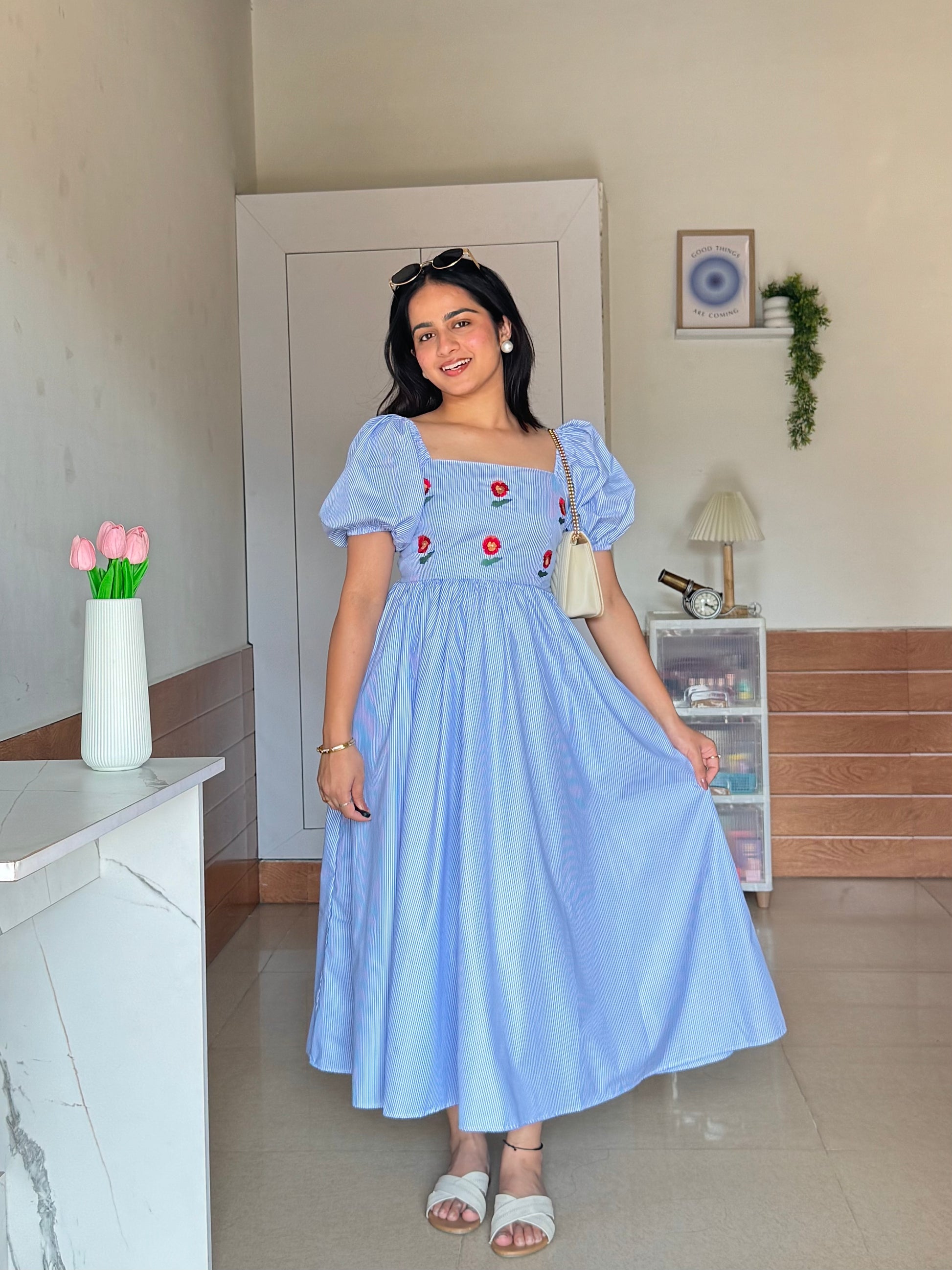 Soft blue-white stripes with delicate floral embroidery on the chest