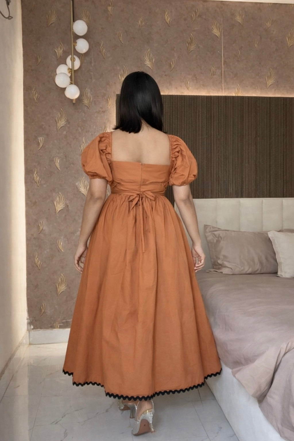 The Zyra Rust Dress is crafted from soft, breathable 100% cotton poplin, making it lightweight and comfortable for warm days.